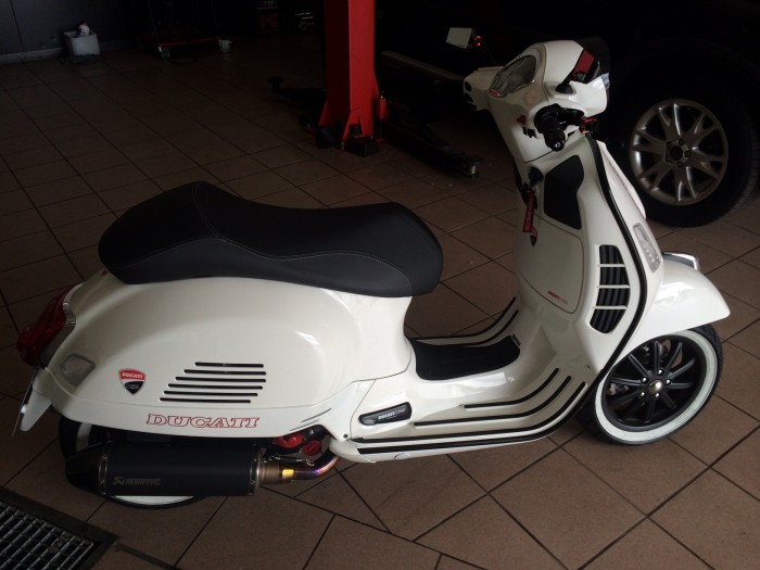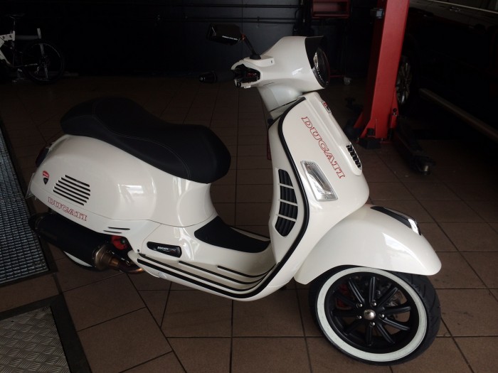 Die Vespa 300GTS Super ABS DUCATI Corse Edition by Mike's Crazy Familia. Der Motor wurde gepimpt und pulverbeschichtet, Malossi 282ccm Zylinder inkl. V4 Head, Malossi Delta-Clutch, Malossi Vario, X-Kev von Malossi, Sekundärgetriebe Malossi,und noch div. Malossiteile usw.